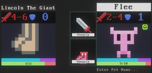 Esse foi o meu jogo favorito esta jam, muito criativo! É uma mistura entre Tamagotchi e RPG. Você precisa tomar conta de um pet que adora entrar em cavernas e matar monstros, mas você não pode deixar ele morrer. Na dungeon ele ataca sozinho, e você precisa decidir quando fugir, mas se o seu pet estiver com baixa felicidade ele vai atacar mais devagar e pode se recusar a fugir! Você precisa alimentar e dar remédio pro seu pet, mas alguns itens deixam o seu pet triste ou tiram vida, então você deve sempre balancear o uso de itens até chegar no final.